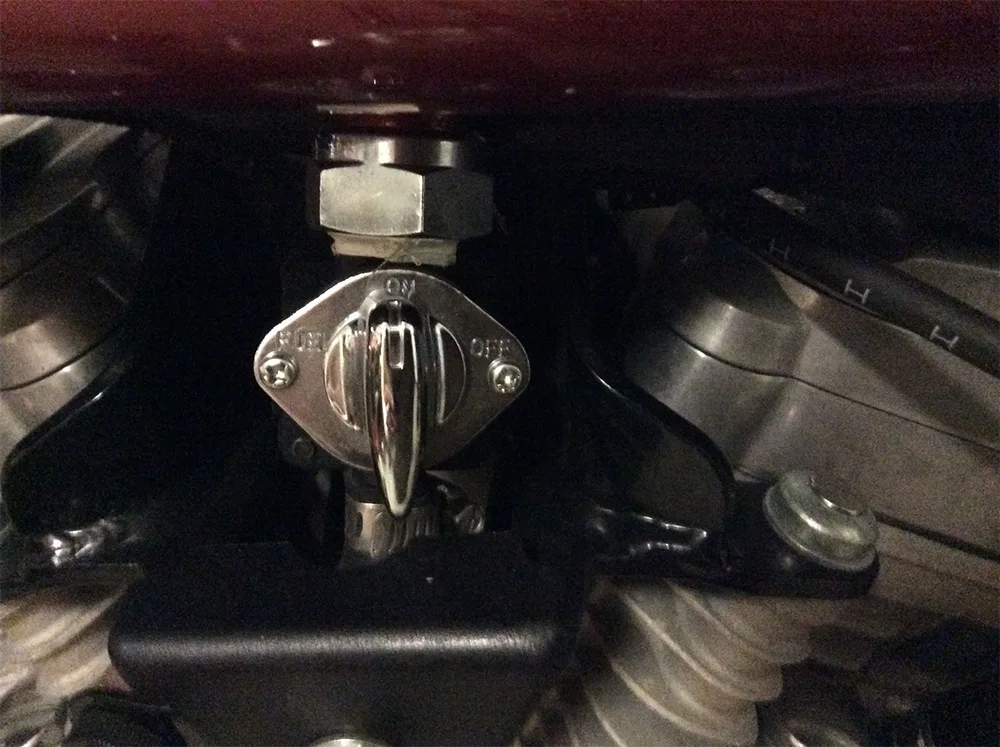 OFF/Off-Symbol: Gang anhalten, Kraftstoffzufuhr unterbrechen. Beim Parken oder Reparieren des Fahrzeugs muss es in diese Position geschaltet werden, um ein Austreten von Kraftstoff oder ein Überlaufen des Vergasers zu verhindern.
